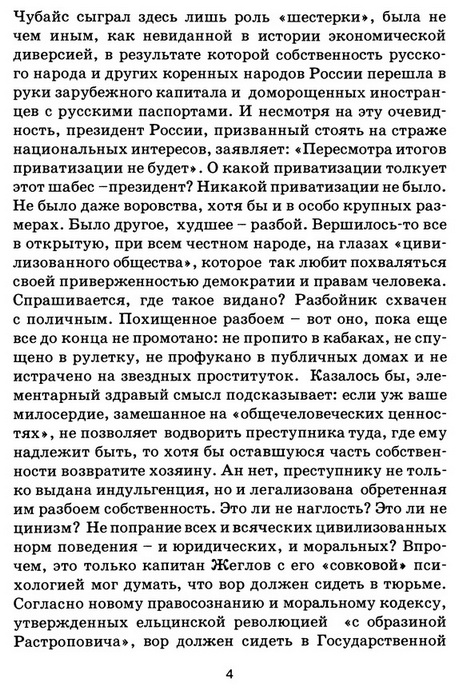 Ответ на этот вопрос прямо дается в докладе о работе в России Гарвардского института международного развития: "США разработали программу помощи реформаторам, деятельность которых СООТВЕТСТВОВАЛА АМЕРИКАНСКИМ ЦЕЛЯМ." Когда было образовано Госкомимущество ("Министерство приватизации") и власть там получили Чубайс и его команда, к ним были приставлены десятки советников из США, которые делали главную работу, писали решения и распоряжения, составляли проекты указов для Елицина Б. Н. С осени 1991 года (после того, как американская разведка помогла Ельцину Б.Н. захватить верховную власть) группу советников при президенте РФ возглавил Джефри Сакс и оставался в этой должности по январь 1994 года. О нем в докладе Гарвардского института сказано: "Самый влиятельный архитектор русских экономических реформ на их начальном этапе". На оплату всей этой агентуры американское Агетство международного развития (USAID) затратило 1 млд. 159 млн. долларов США. Денег не жалели! Но в результате выиграли в сотни раз больше ("The Moscow Times", 1997, june 3, pp.10-12). Учитывая вышеприведенные факты, преступления Чубайса, Коха и Компании следует квалифицировать не только по статьям 158 (кража), 159 (мошенничество), 160 (присвоение или растрата), но и по статье 275 УК (государственная измена). Какова же была в этом преступном деле роль Ельцина Б. Н.? Он - назначал расхитителей и изменников на должности, занимая которые они могли грабить нашу Родину. Он - обеспечивал расхитителям и изменникам политическое прикрытие. Он - создавал для них "правовую базу". Американские резиденты и советники писали проекты указов. Он - подписывал их и придавал им государственную силу. Он - этими указами перечеркивал не только законы, но и конституцию РФ. Кроме того, приватизация нанесла невосполнимый ущерб нашей экономике, ибо: - не дала бюджетных поступлений, хоть сколько-нибудь соизмеримых с размерами прихватизированной собственности (доходы от ее проведения обеспечили лишь 0,15% суммарного российского бюджета, а потери составили более 9,5 КВАДРИЛЛИОНА РУБЛЕЙ в ценах 1995 года, Эта умопомрачительная сумма в 20 раз превысила доходы бюджета за 1996 год!; - привела к фактическому прекращению производственных инвестиций в прихватизированные предприятия; - ускорила распад сложившихся производственно-технологических связей; - создала условия для некомпенсированного присвоения наших передовых технологий зарубежными фирмами и ликвидации конкурирующих с ними российских производств; ускорила катастрофическое падение производства и общее разрушение структуры Российской экономики (более 70% предприятий во всех отраслях народного хозяйства были попросту скуплены за бесценок своими и иностранными "эффективными" собственниками). Кроме того, прихватизация привела к крайне тяжелым социальным последствиям: - резкому сокращению социальной сферы; - коллосальному (до 17-20 млн. человек) росту безработицы; катастрофическому углублению экономического и социального неравенства между слоем баснословнонажившихся "новых русских и нерусских" паразитов и находящимся на грани и за гранью нищеты большинством населения; усилению массового обнищания и пуперизации населения; - криминализации отношений собственности, как основе общей криминализации российского общества. Все это дает основания для характеристики проводимой с самого нач