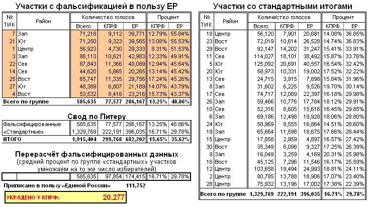 Проделав работу за ГИК, я добавил прежние проценты, которые уже публиковала «Фонтанка.ру» по предварительным данным, полученным… от того же петербургского ГИК!!! (см. их повтор в статье по той же ссылке http://www.fontanka.ru/2011/12/07/065/). В моей таблице разница высчитана в процентных пунктах, и потому разброс кажется невелик, от 4,2 до 7,7 п.п. Но что такое 7,7? это разница между 28,74% и 36,46%. А вот разделите одно на другое, и увидите, что доля голосов при этом возросла на четверть! На вопрос "оппонентов", а почему же не изменился процент по территории "Центральная" — отвечу сам. Смотрите выше, мой пост http://www.kprf.org/showpost-p_245997.html, левая таблица. Ищите ТИК №1 (возглавляют её педороссы), благодаря которой Центральный район успел сфальсифицировать итоги раньше других. Центр как-никак. Кстати, именно в ТИК №1 КПРФ обокрали как нигде ещё в столичных городах — (8,31% по прежним данным). Вы признаёте эту цифру достоверной, товарищи ленинградские коммунисты? И теперь о решающей, итоговой цифре "за ЕР" по всему Питеру. Почти 36%. Теперь больше одной трети. А по предыдущему (менее фальсифицированному) итогу выходило меньше одной трети. Понятно, в чём дело? Есть решения, принятие которых требует как минимум 2/3 голосов. Это, как правило, очень важные решения. И теперь ЕР благодаря фальсификациям может их блокировать. Даже в том теоретическом случае, если вся оппозиция будет против. Фальсификациями на выборах в Питере возмущён весь Интернет. Сегодня 15-тысячная демонстрация в Ленинграде, на Пионерской площади требовала, как сообщает Михаил Сурков (KPRF.RU): Цитата: