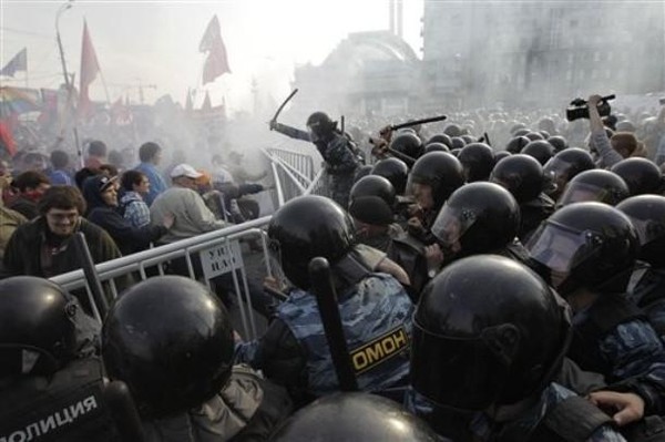А протест на подходе к Большому Каменному мосту нарастает. Люди видят тройные ряды оцепления, автозаки, поливальные установки и «космонавтов» в полой экипировке. Люди понимают, что это возможная ловушка – река, оцепление, цепь ОМОНА – всё это со всех сторон и очень похоже на мышеловку. Вижу издалека анархистов, пошедших на прорыв, крики и тут – начинается… Сначала в людей врезаются небольшие группы ОМОНа – что, думают, что люди, завидев десяток здоровяков с дубинками, побегут, как овцы от волков? Людское море качается, в «героических» защитников летит все, что попадает под руку, ОМОН применяет известный прием рассечения, выхватывает активистов, тех, кто с флагами, отрывает полотнища, валит людей на асфальт, избивает с профессиональностью бандитов, почему-то больше всего охотясь за молодыми людьми и девушками…Люди пытаются строить баррикады из пластиковых туалетов. Где-то вдалеке вижу облако газа… Удары дубинок, хруст, проклятия… Почему-то вспоминаю Высоцкого «Охота на волков»: «Вот уж тот, кому я предназначен, улыбнулся и поднял ружье». И действительно, ОМОН подходит и к той группе, где нахожусь я, двое геркулесов хватают стоящую рядом со мной девушку и волокут ее к машине по асфальту. Странно, в этот момент совершенно не чувствовала страха. Подхожу и твердым голосом говорю: «Что вы делаете? Она же не оказывает сопротивления! Вы нарушаете закон о полиции!». Девушку оставляют в покое, она остается лежать на асфальте, а мне в лицо кричат: «Сейчас мы тебе покажем закон, сучка! Сейчас мы тебя научим любить Президента, подстилка американская!». Думаю – вот сейчас – моя очередь, и решаюсь: «Во-первых, тут я вытаскиваю свое университетское удостоверение, очень похожее на удостоверение МВД – такое же красное и с таким же двуглавым орлом – я для вас – и повышаю голос - не сучка, а доцент высшей математики, у меня учится много ваших сотрудников, а в нашей аспирантуре есть и генералы МВД. Хотите неприятностей?если вы кого-то задерживаете, вы обязаны представиться. Во-вторых, оскорблять не имеете права – читайте инструкции. В-третьих – если вы кого-то задерживаете, вы обязаны представиться». Блеф, но действует! Один «герой» кричит другому – «Оставь ее! На хрена нам неприятности! Еще заберем или стукнем (употребил несколько другое слово) не того, кого надо!»