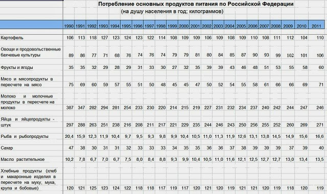 Потребление продуктов питания на душу населения в год, 1990-2011, кг :