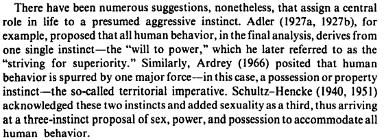 Но был ещё и Шульц-Генке, который добавил к инстинкту власти и инстинкту владения или собственности (posession or property instinct), третий - сексуальность. Так что, если в комплексе, то модель-то "трёхинстинктная" (three-instinct): секс, власть и собственность (sex, power and posession). Она-то и претендует на то, чтобы описать все мотивы поведения человека (to accomodate all human behavior).