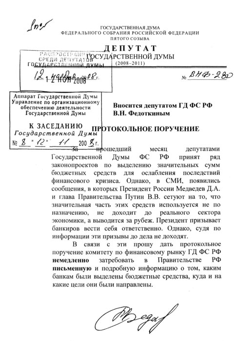 В.Н. Федоткин (фракция КПРФ). – Уважаемые коллеги, два дня мы наблюдаем, как Президент России и глава правительства разводят руками и удивляются, как это деньги, которые должны поддержать реальный сектор, уходят неизвестно куда. Они призывают банкиров вести себя ответственно. Но, судя по имеющейся информации, эти призывы ни до кого не доходят, деньги утекают. В связи с этим прошу дать поручение Комитету по финансовому рынку немедленно, в течение вот этого дня затребовать не в Минфине, а в правительстве не устную, а письменную подробную информацию о том, каким банкам были выделены деньги, куда и на какие цели они были направлены. Подчёркиваю, сегодня. Через две недели, может быть, уже будет поздно. Источник: kprf.ru
