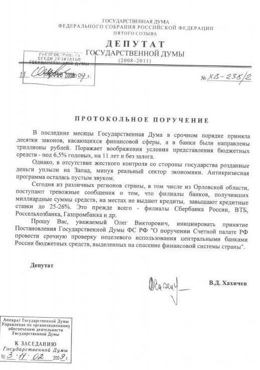 В.Д. Хахичев (фракция КПРФ). – Уважаемые депутаты, последние месяцы Государственная Дума в срочном порядке приняла десятки законов, касающихся финансовой сферы, а в банки были направлены триллионы рублей. Поражают воображение условия предоставление бюджетных средств под низкие проценты годовых и без залога. Однако в отсутствие жёсткого контроля со стороны государства розданные деньги уплыли на Запад, минуя реальный сектор экономики, антикризисная программа осталась пустым звуком. Прошу вас, уважаемый Олег Викторович (О.В. Морозов, первый заместитель Председателя Госдумы – Ред.), инициировать принятие Постановления Государственной Думы о поручении Счётной палате Российской Федерации провести срочную проверку нецелевого использования центральными банками России бюджетных средств, выделенных на спасение финансовой системы страны. Источник: kprf.ru