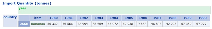 Впрочем, ладно . Импорт бананов, СССР , тонн, Международная продовольственная организация ООН FAOSTAT : http://faostat.fao.org/site/535/default.aspx ![]() Справочник "Внешняя торговля СССР в 1981-м году" стр.42 , позиция 83202 : ![]() Подчеркнул красной линией . Данные советского справочника и FAOSTAT по 1981-му и 1980-му году совпадают . Численность населения СССР : ![]() В 1981-м году было импортировано 56 566 тонн бананов . При численности населения в 1981-м году 266,6 млн.человек , на каждого гражданина приходилось 56 566 000 кг / 266 600 000 чел = 0,21 кг бананов . Или 210 грамм . И это с кожурой и хвостиками , без усушки, утряски, гниения . При таком "изобилии" жрать бананы килограммами могли себе позволить люди с известным доступом к продуктам питания . Или сказочники .
