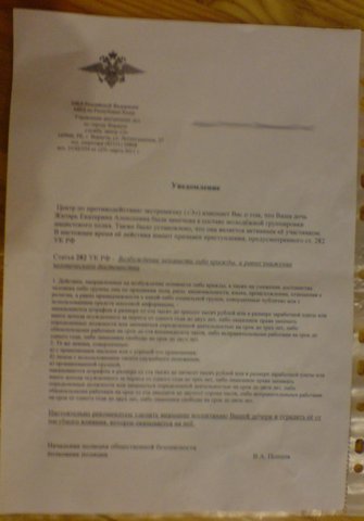 Родителям 13ти летней девочки пришло официальное Уведомление из отдела "Э". В котором рассказывается, что столь юная девушка является активным участником некого экстремистского движения нацистского толка. В настоящее время в её деятельности находят признаки преступления, предусмотренного ст 282 УК РФ. На лицо абсурдность ситуации. Тем более что Екатерина не состоит ни в одной организации. А просто подписалась, на сайте социальной сети [В]контакте, на страничку "Русская Воркута". Источник: http://russianvorkuta.lya.ru/content/n3.htm |