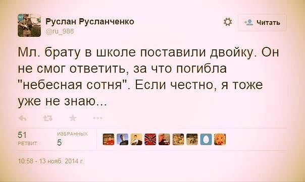 - Потому что Крым - это единственное место, где действительно есть российская армия. Главная цель повышения стоимости проезда в Киеве, чтобы народ не смог приехать на Майдан. — Когда Украина станет членом ЕС? — После Турции. — А когда станет Турция? — Никогда. |