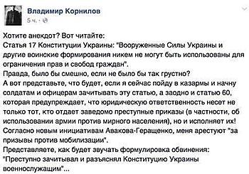 - Ильинична, как дела, где твой сынок? - Мой от мобилизации отказался - в тюрьме сидит ... Пауза ... - А мой согласился - в гробу лежит! - Тук-тук-тук! - Хто там? - Слава Україні! Це я, листоноша Пєчкін! Приніс повістку для вашого хлопчика! - Пішов на куй, Пєчкін! Героям Слава! |
