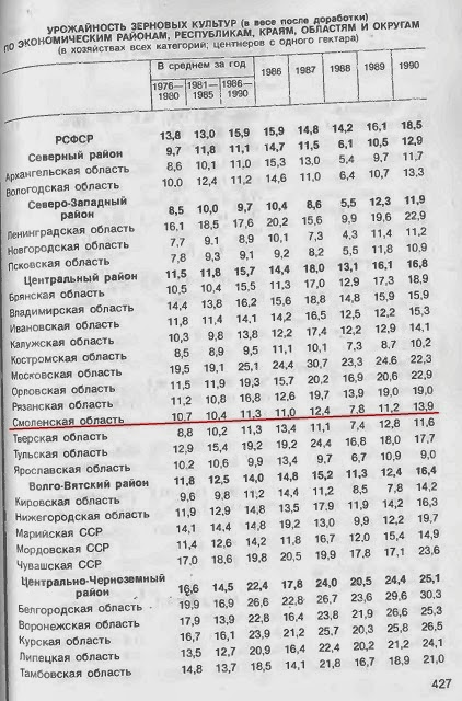 Урожайность зерновых в центнерах с каждого гектара в Смоленской области в советское время находилась ... : ![]() ГОСКОМСТАТ СССР Справочник "Народное хозяйство РСФСР в 1990-м году" ... В пределах 7,8-13,9 , а урожайность в Белоруссии в советское время находилась в пределах ... : ![]() ГОСКОМСТАТ СССР "Справочник народное хозяйство СССР в 1990-м году" ... 13,1 - 27,4 ? generator Смоленщина - 7,8 - 13,9 ; Белоруссия - 13,1 - 27,4 Есть какие-нибудь мысли ?