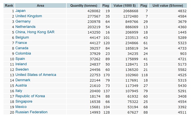 ![]() Как видим, лидер по импорту курятины - Япония, за ней идёт Великобритания, Германия, Нидерланды ..., Россия на 20-м .
