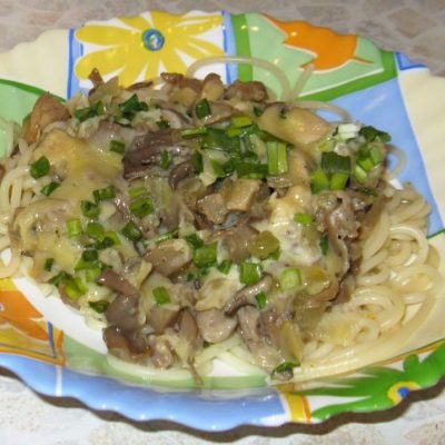 ![]() Ингредиенты Грибы - 500 г (вешенки) Сыр - 100 г Репчатый лук - 2 головки (крупные) Соль - по вкусу Молотый черный перец - по вкусу Растительное масло - 1-2 стл. Зелень - по вкусу Лук репчатый очистить и меленько нарезать. На раскаленную сковороду налить растительное масло, обжарить на нем лук на среднем огне, периодически помешивая, в течение 2-3 минут. Пока жарится лук, промыть вешенки промыть под проточной водой, слегка обсушить, затем нарезать. К обжаренному луку выложить вешенки. Посолить, поперчить по вкусу. Жарить вешенки 10-15 минут до готовности. Натереть сыр на мелкой терке. Сыром посыпать вешенки, дать ему слегка подтаять (1 минуту). Готово |