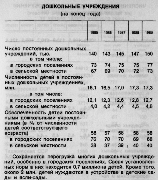 Сохраняется перегрузка многих дошкольных учреждений, особенно в городских поселениях . Сверх установленных норм в них находится 0,7 миллиона детей . Кроме того, около 2млн. детей нуждаются в устройстве в детские сады и ясли .