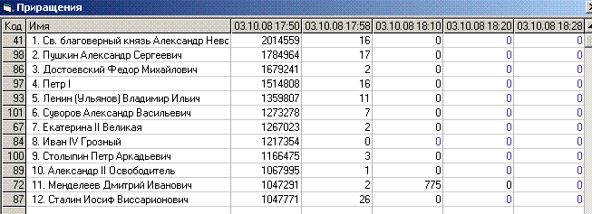 1 Св. благоверный князь Александр Невский 2 014 575 2 Пушкин Александр Сергеевич 1 784 981 3 Достоевский Федор Михайлович 1 679 243 4 Петр I 1 514 824 5 Ленин (Ульянов) Владимир Ильич 1 359 818 6 Суворов Александр Васильевич 1 273 285 7 Екатерина II Великая 1 267 025 8 Иван IV Грозный 1 217 354 9 Столыпин Петр Аркадьевич 1 166 478 10 Александр II Oсвободитель 1 067 996 11 Менделеев Дмитрий Иванович 1 048 068 12 Сталин Иосиф Виссарионович 1 047 797 За последние 3 часа 30 минут, насчитали 1510 голосов, из них Менделеев получил больше половины 809. Менделеев опять резко скаканул и переместился на 11 места, Сталина отодвинули на 12 место. В общем стали накручивать Менделееву. P.S. На сайте написано что голосование должны были в 22-00 остановить, в это время не видел, так что возможно выше сказанное случилось за 1 час 50 минут, а скорей всего вброс был таким же быстрым как в данных от Ефремов что ещё больше впечатляет в качестве накрутки Менделееву