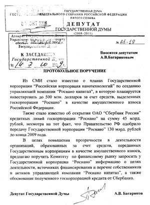 2009-10-07 21:57 Пресс-служба депутата Госдумы А.В. Багарякова 7 октября на пленарном заседании Государственной Думы депутатом А.В. Багаряковым было подано протокольное поручение Комитету по финансовому рынку запросить в госкорпорации "Роснано" информацию о целях деятельности и источниках финансирования Управляющей компании "Роснано капитал". Депутат в своем поручении выразил обеспокоенность по поводу целесообразности создания госкорпорацией "Роснано" Управляющей компании, а также открытие кредитной линии в Сбербанке на сумму 45 млрд. рублей. "Из СМИ стало известно о планах Государственной корпорации “Российская корпорация нанотехнологий” по созданию управляющей компании “Роснано капитал”, в которую планируется инвестировать до 500 млн. долларов за счет средств, выделенных госкорпорации “Роснано” в качестве имущественного взноса Российской Федерации. Также стало известно об открытии ОАО “Сбербанк России” кредитных линий госкорпорации “Роснано” на сумму 45 млрд. рублей, несмотря на тот факт, что Правительство РФ одобрило передачу Государственной корпорации “Роснано” 130 млрд. рублей до конца 2009 года. В целях повышения прозрачности в деятельности организаций, образованных за счет средств, переданных Государственным корпорациям в качестве имущественного взноса, предлагаю поручить Комитету по финансовому рынку запросить у Государственной корпорации “Роснано” информацию о целях деятельности, источниках финансирования и перечне собственников и активов управляющей компании “Роснано капитал”, а также обоснование полученного госкорпорацией кредита от Сбербанка».