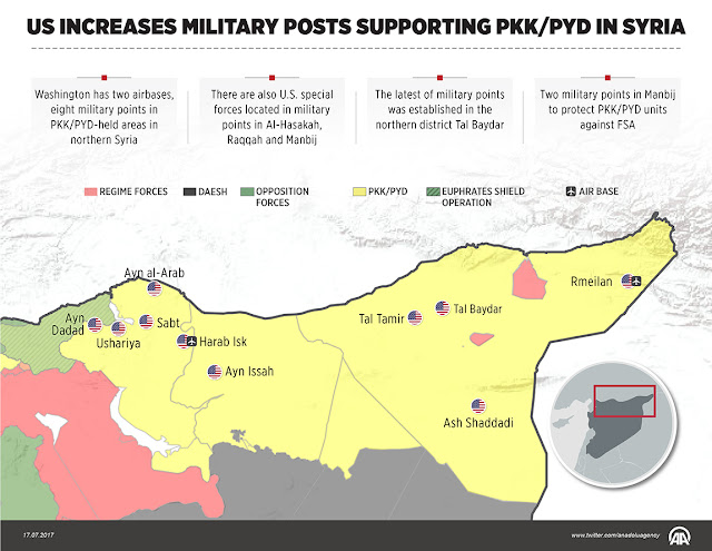 Турецкое информационное агентство Анадолу опубликовало карту американских военных баз в северо-восточной Сирии по состоянию на 19 июля 2017 года, поскольку турок тревожит военная помощь американцев в среди прочих и той части курдов, с которыми у турецкого правительства имеются напряжение отношения.
