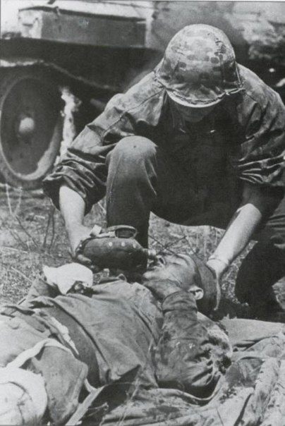 Наткнулся на фото в интернете. Известная фотография , споры вокруг которой не утихают и поныне. Начало июля 1943 года. Солдат Ваффен СС подошел к советским солдатам, один из которых смертельно ранен. Раненому оказана первая помощь, у него повреждены руки и ноги. В следующий момент солдат SS наклонится над смертельно раненым и даст ему воды из своей фляги.