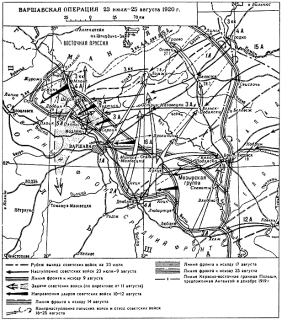 Карта с указанием контрудара Среднего фронта белополяков (командующий с 14 августа 1920 года - Пилсудский). Видно, что северная группировка советских войск соприкасалась с Восточной Пруссией, где и была интернирована.