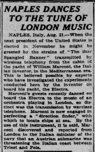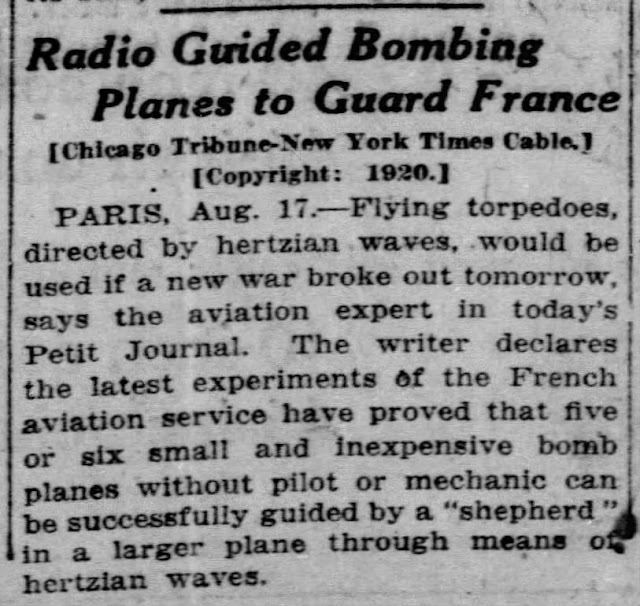 ![]() Летающие торпеды, управляемые по радио, могли бы использоваться, если завтра начнется новая война. Такое заявление авиационного эксперта было напечатано в “Petit Journal” 17 августа 1920 года. Эксперт заявляет, что результат последних экспериментов, проведенных французской авиационной службой, показал возможность успешного управления пяти или шести небольших и недорогих бомбардировщиков без пилота или без механика с более крупного “пастуха” посредством радиоволн. Ниже - вырезка из статьи в "Le Petit Journal" от 17 августа 1920 года об эксперименте, произведенном на аэродроме Кротуа в Нормандии (на французском языке, автор статьи Jaques Mortane. Французским не владею, поэтому перевода нет): ![]() и еще одно достижение радио: ![]() Неаполь, Италия, 21 августа 1920 года. Следующего президента США, который будет избран в ноябре 1920 года, могут встретить звуки гимна «Звездное знамя», переданные по беспроводной телефонной связи с яхты итальянского изобретателя Гульельмо Маркони в Средиземном море. Эксперты, изучавшие эксперименты, проведенные изобретателем на борту его яхты "Электра", полагают, что это возможно. Гости Маркони недавно танцевали на борту "Электры" под музыку оркестра, игравшего в Лондоне, настолько четкой была передача по беспроводному телефону. Сейчас Маркони занимается доводкой «пеленгатора», с помощью которого можно определять местонахождение кораблей в море. Говорят, что с помощью этого прибора Маркони обнаружил и сообщил из Лондона итальянскому военно-морскому министру, что австрийская подводная лодка угрожает итальянскому побережью между Триестом и Полой.