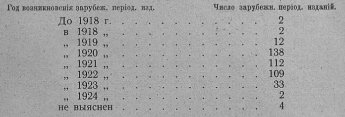 Согласно этой информации, на 1920 год приходится резкий (в 11,5 раз) рост числа периодических (в основном новостных) печатных зарубежных изданий на русском языке в Берлине, Харбине, Париже, Варшаве, Белграде, Нью-Йорке и многих других городах мира. Цитата из статьи: "Учесть опыт созидания русской зарубежной печати в полном объеме я, при всем желании, не могу. В моем распоряжении, прямо скажу, скудный матеріал, далеко не полный и не дающій ответа на ряд весьма существенных вопросов. Цифры, приводимыя здесь, при более полном обследованіи должны измениться, так как в тех данных, на которых они основаны, немало пробелов и неясностей. Тем не менее, однако, думается, что для первой оріентировки, для самой общей характеристики состоянія зарубежной прессы, для иллюстрации хода дела в целом и эти скудныя сведенія пригодны. Они прежде всего показывают, как в самом деле многочисленны были попытки создать русскую прессу за рубежом. Таких попыток насчитывается, по имеющимся неполным данным, 414. Они были произведены в 81 месте, главным образом, в Европе - 51; в Азіи таких попыток насчитывается _ 22; в Америке - 15; в Африке - З. Подавляющее большинство этих литературных начинаній относится в трехлетію 1920-1922 г.г. Возникновеніе русскаго періодическаго изданія до 1918 отмечается только в двух случаях. В 1918 и 1919 г.г. предпріятія такого рода тоже были единичны. Данные для последующаго времени, вероятно, требуют значительных поправок и, быть может, свидетельствуют о том, что предложеніе успело уже насытить спрос, и что дальнейшее развитіе будет совершаться в более умеренном и спокойном темпе. Но указанное трехлетіе отмечено поистине лихорадочным строительством в области зарубежной прессы. Вот небольшая таблица, цифры которой говорят сами за себя: ![]() "