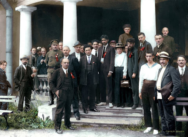 ![]() Группа делегатов 2 Конгресса Коминтерна (цвет добавлен Klimbim). Лев Карахан (второй слева), Карл Радек (третий, курит), Николай Бухарин (пятый), Михаил Лашевич (седьмой, в военной форме), Максим Горький (девятый, бритый, сзади Ленина), Ленин (десятый), Сергей Зорин (одиннадцатый, в шляпе), Григорий Зиновьев (тринадцатый, руки за спиной), Мария Ильинична Ульянова (девятнадцатая, в белой блузке), Абрам Беленький (в шляпе). Длинный в центре - индус Манабендра Рой (Manabendra Roy). В середине с длиной бородой итальянец Никола Бомбаччи (Nicola Bombacci), который в 1943 году присоединился к фашистской Итальянской социальной республике. слева от Роя Charles Shipman (Jesús Ramírez), из-за колонны слева выглядывает Максим Пешков, сын Горького. Самый верхний, в фуражке - Авров Дмитрий Николаевич. Крайний справа Наум Маркович Анцелович