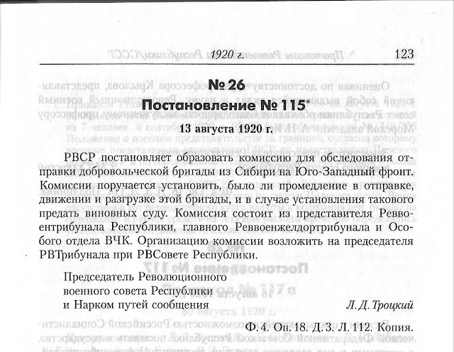 Комиссии поручается установить, было ли промедление в отправке, движении и разгрузке этой бригады, и в случае установления такового предать виновных суду. Комиссия состоит из представителя Реввоентрибунала Республики, главного Реввоенжелдортрибунала и Особого отдела ВЧК. Организацию комиссии возложить на председателя РВТрибунала при РВСовете Республики.