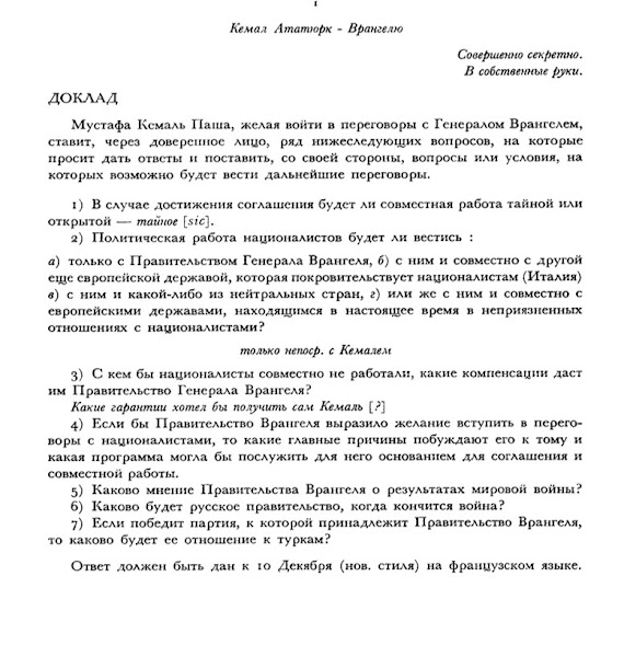 Кемалю предстояло еще два тяжелых года, прежде чем случилось третье чудо (после чуда №2 - "чуда на Висле") - греки, имея неплохие, но пассивные позиции, вдруг без видимой причины обмякли и ретировались из Измира и вообще из Турции в августе-сентябре 1922 года, уже при другом греческом премьере. Среди первых же публичных контактов кемалистов, относящихся еще к концу 1919 года, оказалась Москва, приветствовавшая “национально-освободительное” движение и предоставившая финансовую помощь размером несколько миллионов золотых рублей. Правда туркам-националистам пришлось весной 1920 года уступить Красной Армии Баку, Батум и Ереван. Одновременно Мустафа Кемаль-паша установил тайное сотрудничество с Врангелем во время нахождения последнего в конце 1919 года в Константинополе после размолвки с Деникиным. Об этом свидетельствует документ, опубликованный в работе махрового антисоветчика Пайпса “Дипломатические отношения правительства Врангеля в Крыму, 1920”, Cahiers du Monde Russe Année 1963 4-4 pp. 401-435 Вполне возможно, что часть советских миллионов, полученных Мустафой Кемалем весной-летом 1920 года, пригодились Врангелю в британской зоне Константинополя после ноября 1920 года. Куда-то ведь надо было девать белогвардейские склады с оружием и боеприпасами, чтобы не оставлять красным. Одновременно выясняется, что Врангель вел фактически с июня 1920 года, а не только осенью 1920 года, как он пишет Струве, секретную подготовку к эвакуации из Крыма под легендой о “подготовке десанта в Одессу”, что могло оказать влияние на решения заинтересованных лиц.