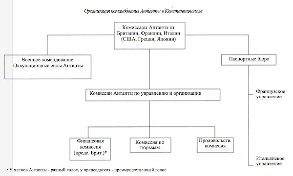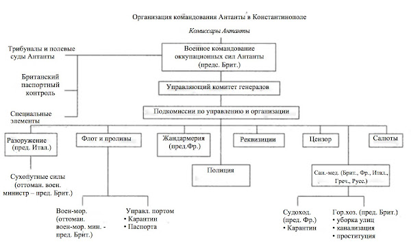 https://books.google.ru/books?id=Spo...page&q&f=false Привожу одну главу из этого исследования, дающую представление об отношениях внутри Антанты, а также организационные схемы администрации оккупированного Стамбула. ============= Администрация Антанты После оккупации Стамбула 13 ноября 1918 года вопрос о военном командовании местными войсками Антанты создал проблему в отношениях между Францией и Великобританией, что явилось лишь слабым отражением соперничества двух стран на Ближнем Востоке. Мир с Турцией был заключен не так быстро, как ожидали или желали управляющие Антанты в Стамбуле. В течение пяти с половиной лет оккупации Стамбула между ними возникали не только единичные разногласия, но и росло взаимное недоверие в целом. После 1920 года Антанта установила сложный бюрократический порядок. В административном аппарате имелись «врожденные» слабые места, которые турецкое подполье тут же использовало. Например, Ускюдар, вход в Анатолию (Малую Азию) через азиатскую сторону Стамбула, был итальянской зоной, и там контроль был менее строгим. Переправлять людей из Ускюдара в Анкару было относительно легко. Старый город и западные пригороды находились во французской зоне. В 1920 году отношение Франции к турецкому сопротивлению изменилось на благоприятное. Кроме того французы имели то преимущество, что они могли общаться с турками, потому что у многих образованных турков французский был вторым языком. Британская зона находилась в космополитических районах Пера, Галата и Шишли (в ноябре 1920 года вместе с врангелевскими войсками именно в британскую зону прибыли беженцы из Крыма https://www.kommersant.ru/doc/4567641?from=doc_vrez ). Действия британцев были открыто направлены на наказание, а не на общение с турками. Почти все свидетели того времени согласны, что итальянцы были «джентльменами-оккупантами», французы были «безобидными» за исключением сенегальских солдат, которые приставали к женщинам, американцы были «приятными», а вот британцы были «врагами». В ноябре 1918 года Антанту в Стамбуле представляли британец сэр Сомерсет Артур Гоф-Калторп, итальянец граф Карло Сфорца и француз адмирал Амет. Генеральным консулом Соединенных Штатов и комиссаром был Дж. Б. Равндал. Лишь в 1919 году Верховный совет Антанты в Париже решил назначить верховных комиссаров в дополнение к военным начальникам. Тем временем британцы и французы соревновались в Стамбуле за престиж своих стран.. Для Франции казалось естественным, чтобы главнокомандующий армиями Антанты на Востоке генерал Франше д'Эспере (1856-1942) принял военное командование в Стамбуле. Однако британское командование не хотело мириться с французским лидерством. После того, как 11 ноября 1918 года в Европе было подписано перемирие, генерал д'Эспере ждал в Софии приказа от своего правительства отправиться в Будапешт, чтобы проследить за выполнением Венгрией условий перемирия. Вместо этого Париж приказал ему отправиться в Стамбул для координации дел. Генерал д'Эспере не доверял британцам. На совещаниях с британским командованием в 1917 году по вопросу раздела Ближнего Востока он чувствовал, что британцы хотят обмануть французов, получив контроль над Малой Азией.3 Французский генерал нанес краткий визит в Стамбул в ноябре 1918 г. и вернулся на Балканы. Он снова прибыл в Стамбул 8 января 1919 года и был торжественно принят своими коллегами по Антанте и с