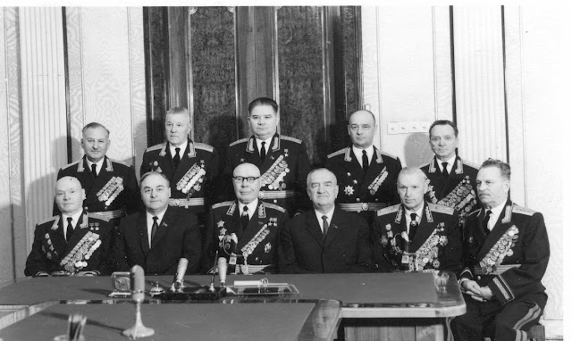 ![]() Группа генеральных инспекторов Министерства обороны СССР после награждения в Кремле, февраль 1968 года. Слева направо: стоят — маршал артиллерии Одинцов, генералы армии Горбатов, Гетман, Соколов, Батов; сидят — генерал армии Лелюшенко, секретарь Президиума Верховного Совета СССР Георгадзе, Маршал Советского Союза Тимошенко, заместитель Председателя Президиума Верховного Совета СССР Яснов, Маршал Советского Союза Рокоссовский, генерал армии Тюленев Конармеец Тимошенко, начальник 6 кав.дивизии 1 Конной Армии, известной своим антисоветским бунтом после польской кампании (Тимошенко, правда, именно в этот период перешел в другую часть 1КА), и будущий министр обороны Соколов, у которого в 1987 году через все заслоны ПВО беспрепятственно летал западногерманский самолет и приземлялся на Красной площади, а немец-пилот Руст, как и Пилсудский в 1920 году, недоумевал: "Где же истребители, ракеты?" Примечательно, что на фото - группа награжденных в связи с 50-летием Вооруженных Сил СССР. Попасть в одну группу значит иметь что-то общее, ведь таких групп под юбилейное награждение было немало. Значит, было что-то общее между этими представителями двух поколений, Тимошенко и Соколовым. Не дружба семьями, личное знакомство и т.п., а нечто из области общего мировоззрения.
