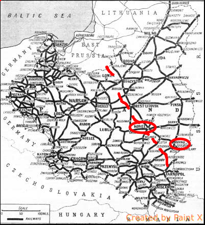 ![]() Железные дороги Польши в 1920 году. Красной прерывистой линией показано примерное расположение Красной Армии к августу 1920 г. Красными овалами выделены Ровно и Ковель, находившиеся под контролем советских войск. Видно, что имелась связь север-юг через Брест-Литовский до Ковеля - Ровно.