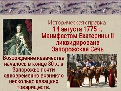 14 августа 1775 года Императрица Екатерина II подписала манифест «Об уничтожении Запорожской Сечи и о причислении оной к Новороссийской губернии». Этим Имперским указом фактически была упразднена казацкая Запорожская Сечь, просуществовавшая почти четверть тысячелетия.