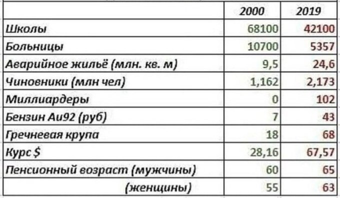 11:19 27.11.2019 в рубрике Политика Несогласный гражданин 8827 101 17 Путинское «процветание» в цифрах, или как угробить страну за 20 лет Не нужно никаких внешних врагов, чтобы превратить Россию в зону социально-экономического бедствия: достаточно одного Путина и его приспешников Провластные псевдожурналисты ![]() . Запад разберется со своими проблемами сам, а у нас общество разделилось: одни верят в царя и думают, что благодаря ему Родина становится великой, другие уверены, что страна катится в пропасть, и застой был бы еще крайне позитивным диагнозом. Посмотрим, что говорят об этом цифры. Мерилом благополучия часто считают объекты инфраструктуры – чем их больше, тем лучше. В 2000 году школ в России было 68,1 тысяч, в 2019 году – 42,1 тысячи. Какое будущее может быть без образованной молодежи? А тем временем с больницами ситуация еще хуже – было 10,7 тысяч, а стало почти ровно вдвое меньше, 5357. О том, что некоторые действующие государственные медицинские учреждения грозят рухнуть прямо на голову пациентам и персоналу, не стоит и говорить. Другой аспект – аварийное жилье. В момент прихода Путина к власти такового было 9,5 млн кв. м, а сейчас – уже 24,6 млн кв. м. Безусловно, старые дома постепенно приходят в упадок, но чем занимаются чиновники, почему не строятся новые здания? Почему люди до сих пор ютятся в утлых хибарах? Тем более, что природных богатств у нас море, и они могли бы стать основой всеобщего благополучия, да вот беда – тут тоже что-то не сложилось. Как известно, Россия – страна нефтедобывающая, и по логике бензин у нас должен быть дешевым. Пока в некоторых арабских странах топливо дешевле воды, у нас А92 за 19 лет подорожал вшестеро – с 7 до 43 рублей. Инфляция коснулась и других товаров – гречневая крупа, например, выросла в цене с 18 до 68 рублей. Скакнул и курс доллара, который влияет на покупательную способность граждан в отношении зарубежных товаров – если в 2000 году он стоил около 28 рублей, то сейчас – более 67, а было и еще хуже. Мечты о достойной старости уже вообще не выглядят реальными, ведь пенсионный возраст подняли: с 60 до 65 лет для мужчин, и с 55 до 63 лет – для женщин. Все неудачи можно было бы простить, действительно поверив в то, что наши беды – это происки завидующего Запада, но и тут происходят странные явления: пока всем становится хуже, представителям власти и их приближенным не горюется совершенно. В 2000 году в России не было ни единого миллиардера, а сейчас их 102! Это еще можно было бы списать на инфляцию, но заодно вырос бюрократический аппарат: армия чиновников удвоилась, и если раньше за счет налогов кормились 1,162 миллиона служащих, то в 2019 году – уже 2,173 миллиона! Стоит ли удивляться, что в бюджете нет денег на пенсии или ремонт больниц, зарплаты учителей или врачей? итоги первого периода путинского правления По поводу же баз во Вьетнаме и на Кубе, а также всего ВПК неплохо так Ю.Мухин написал - ....АМЕРИКАНСКИЙ ХОЛУЙ ПУТИН(с сайта Ю.Мухина) Макфол специалист по сохранению нужных США режимов, скажем, в 1996 году он работал в предвыборном штабе Ельцина, а не Явлинского. Но эта же пресса глухо промолчала, что 20 января в Москву прибыли мощи Генри Киссинджера, который перед отъездом пояснил американской элите цель своей поездки: «Соединенные Штаты минимизируют Китай и Россию, и последним гвоздем в их гроб будет Иран, который, конечно же, главная цель Израи