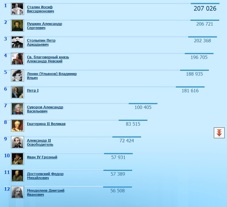 1 Сталин Иосиф Виссарионович 208 824 2 Пушкин Александр Сергеевич 208 298 3 Столыпин Петр Аркадьевич 203 224 4 Св. благоверный князь Александр Невский 197 370 5 Ленин (Ульянов) Владимир Ильич 189 185 6 Петр I 181 943 7 Суворов Александр Васильевич 100 647 8 Екатерина II Великая 83 618 9 Александр II Oсвободитель 72 578 10 Иван IV Грозный 58 282 11 Достоевский Федор Михайлович 57 562 12 Менделеев Дмитрий Иванович 56 639