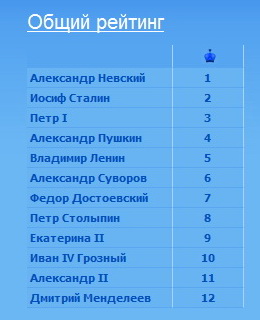 1 Св. благоверный князь Александр Невский 52 721 2 Петр I 48 628 3 Пушкин Александр Сергеевич 41 027 4 Сталин Иосиф Виссарионович 31 216 5 Суворов Александр Васильевич 21 233 6 Достоевский Федор Михайлович 18 708 7 Ленин (Ульянов) Владимир Ильич 17 825 8 Столыпин Петр Аркадьевич 16 017 9 Екатерина II Великая 11 326 10 Иван IV Грозный 11 121 11 Менделеев Дмитрий Иванович 9 338 12 Александр II Oсвободитель 9 289