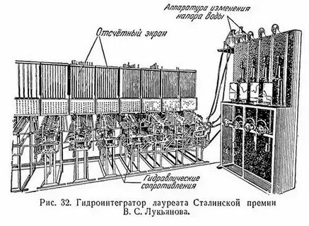 Компьютер, но не электрический. Гидроинтегратор — гидравлический вычислитель: Вода, перетекающая из одной стеклянной трубки в другую, позволяла решать дифференциальные уравнения с частными производными. Дело было в период индустриализации СССР, когда свежеиспеченный инженер Владимир Лукьянов попал на строительство железной дороги и столкнулся в проблемой невысокого качества бетонирования (при застывании бетон растрескивался). Лукьянов предположил, что это связано с температурными напряжениями и обобщил существующие теоретические наработки. Процесс описывался дифференциальными уравнениями, требующими длительных расчетов, но Лукьянов увидел главное — аналогию между уравнениями, описывающими теплообмен, и уравнениями, описывающими течение жидкости. Т.е. первый процесс можно было смоделировать с помощью второго. Через нескольких лет Лукьянов создает аппарат для решения этой совершенно конкретной задачи — анализа изменения температуры в бетоне в зависимости от его состава, технологии заливки и внешних условий. Пример решаемой задачи Теплопередача в нестационарных условиях — охлаждение многослойной плоской стенки. Модель собирается из ряда цилиндрических сосудов, последовательно соединенных между собой калиброванными трубками. Каждый из сосудов имитирует теплосодержание слоя стенки, на которые разбито исследуемое ограждение. Сосуды наполняются водой до уровней, соответствующих начальной температуре в каждом из слоев, после чего открываются краны, и вода из сосудов начинает вытекать. Изменение уровней воды в сосудах при этом будет аналогичным изменению температур в соответствующих слоях стенки при ее охлаждении. Использованы следующие аналогии с теплотехническими параметрами исследуемых ограждающих конструкций: а) уровни воды в сосудах в см соответствуют разностям температур слоев и воздуха в градусах; б) площади поперечного сечения сосудов в см соответствуют теплоемкости слоев в ккал/градус; в) количество воды в сосудах в см соответствует теплосодержанию слоев в ккал; г) гидравлические сопротивления трубок в мин/см(?), соединяющих сосуды между собой, соответствуют термическим сопротивлениям слоев в град-ч/ккал; д) гидравлическое сопротивление у выходной трубки соответствует сопротивлению теплопереходу от поверхности стены к воздуху в град-ч/ккал; е) расход воды в см/мин соответствует тепловому потоку в ккал/ч. Масштаб времени, т. е. отношение фактической продолжительности процесса теплопередачи в часах к длительности процесса на гидроинтеграторе в минутах, равен произведению отношения теплоемкости к площади сечения сосуда на отношение термического сопротивления к гидравлическому сопротивлению. Для возможности фиксации температур (уровней воды в сосудах) в определенные моменты времени гидроинтегратор имел специальное приспособление, одновременно перекрывающее все краны между сосудами. В этот момент нужно было отметить на миллиметровой бумаге, расположенной за трубками, уровни воды в пьезометрах. Затем краны открывали, и так до следующего замера. Полученная в итоге кривая являлась решением уравнения. Иными словами, интегратор позволял заменить процесс, прямое наблюдение за которым затруднено, аналогичным, но более наглядным процессом. При этом важно то, что оба процесса описывались один