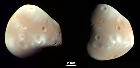 Поперечник Деймоса (Deimos) составляет примерно 12 километров. Его орбитальный период равен 1 дню 6 часам 17,9 минуты. Эта марсианская луна обладает довольно гладкой поверхностью - благодаря залежам рыхлого материала - реголита, засыпавшего все кратеры, кроме самых свежих и самых крупных. В целом это темный красноватый объект, во многом подобный своему более крупному собрату - Фобосу. Впрочем, данное изображение не ограничивается естественными цветами, захвачена также и область ближнего инфракрасного диапазона. (Можно сравнить с аналогичными снимками Фобоса (Phobos), сделанными той же камерой HiRISE 23 марта 2008 года, а также со снимками Фобоса и Деймоса 2007 года, полученными другой камерой.) Масштаб оригинального изображения составляет примерно 20 метров на пиксель, при этом можно легко наблюдать детали величиной как минимум в 60 метров. На левом снимке солнце освещает Деймос из левого верхнего угла, на правом - свет падает справа. Цветовые вариации, хорошо различимые на поверхности Деймоса и Фобоса, судя по всему, отражают временной масштаб воздействия на те или иные участки поверхности внешней космической среды. За миллиарды лет "экспозиции" материал, лежащий на поверхности и подвергнутый воздействию солнечной радиации и космических лучей, разогреваемый при соударениях крошечных метеоритов, темнеет и краснеет. Более яркая и менее красная поверхность наблюдается там, где воздействие открытого космоса было менее длительным - это, например, может означать какое-либо импактное воздействие (т.е. столкновение с более крупными метеоритами и астероидами) или же сдвиги в реголитовой толще. Источник: Deimos, Moon of Mars - HiRISE Взято с: grani.ru