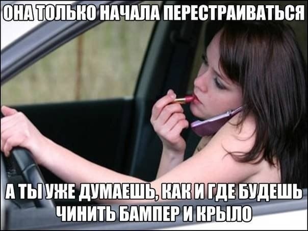 Буквально на днях видел такую любительницу красить губы за рулем, в итоге бампер все же пришлось чинить, но слава Богу не мне.