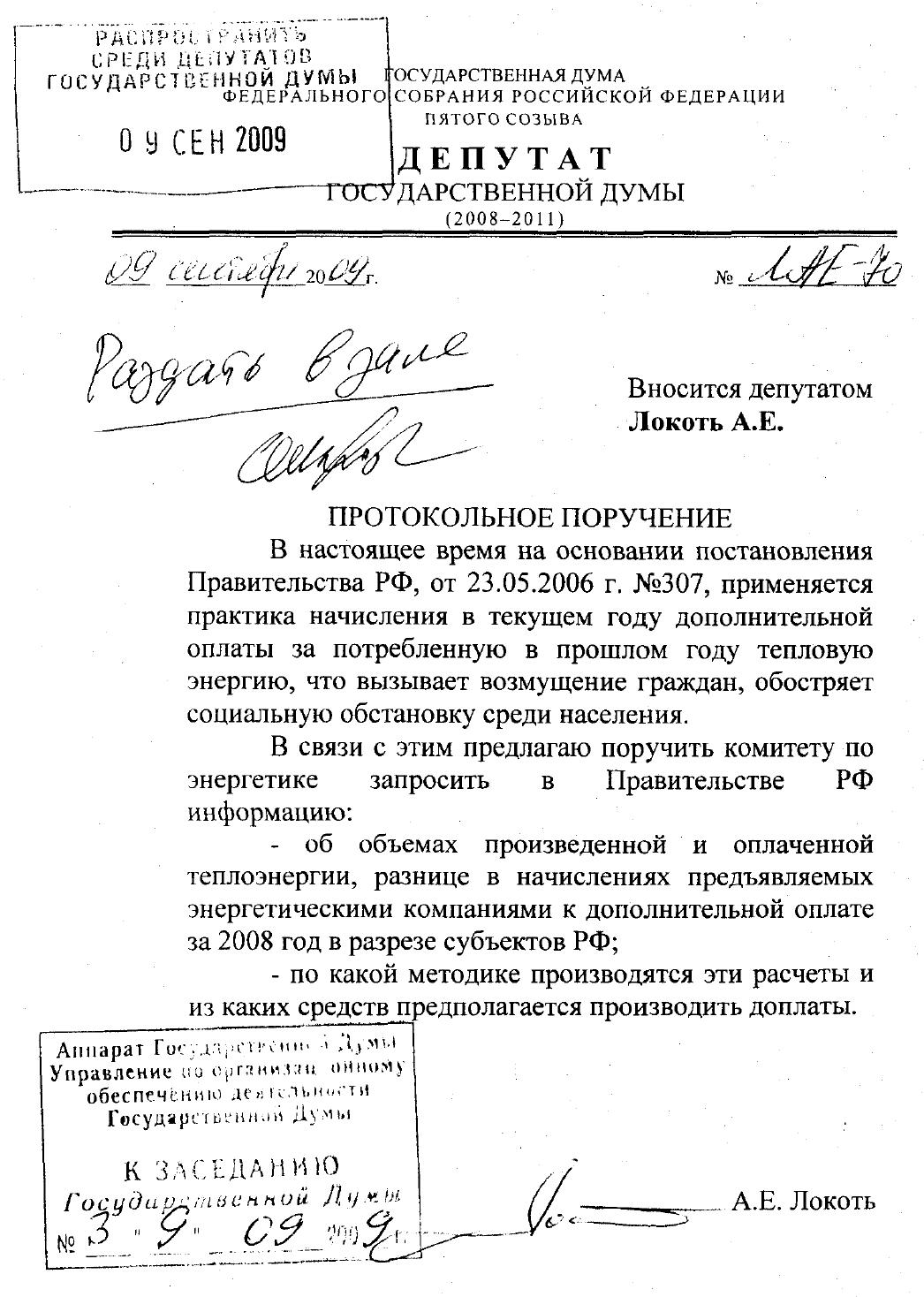 Уважаемые депутаты! Катастрофа на Саяно-Шушенской ГЭС и последовавший дефицит энергии привели к удорожанию электроэнергии. В Новосибирске квартиросъёмщикам предложено доплатить в сентябре-октябре этого года дополнительно деньги за электроэнергию на общую сумму более 600 миллионов рублей. На каждого приходится 500, 1000 и более рублей. Делается это в соответствии с постановлением Правительства Российской Федерации № 307 от 2006 года. Растёт возмущение граждан. Депутаты городского совета единодушно не поддержали эту практику. В связи с этим прошу поддержать протокольное поручение, запросить информацию об объёмах произведённой и оплаченной теплоэнергии, разницы в начислениях, предъявляемых энергетическими компаниями, выяснить, по какой методике производятся эти расчёты. Источник: kprf.ru
