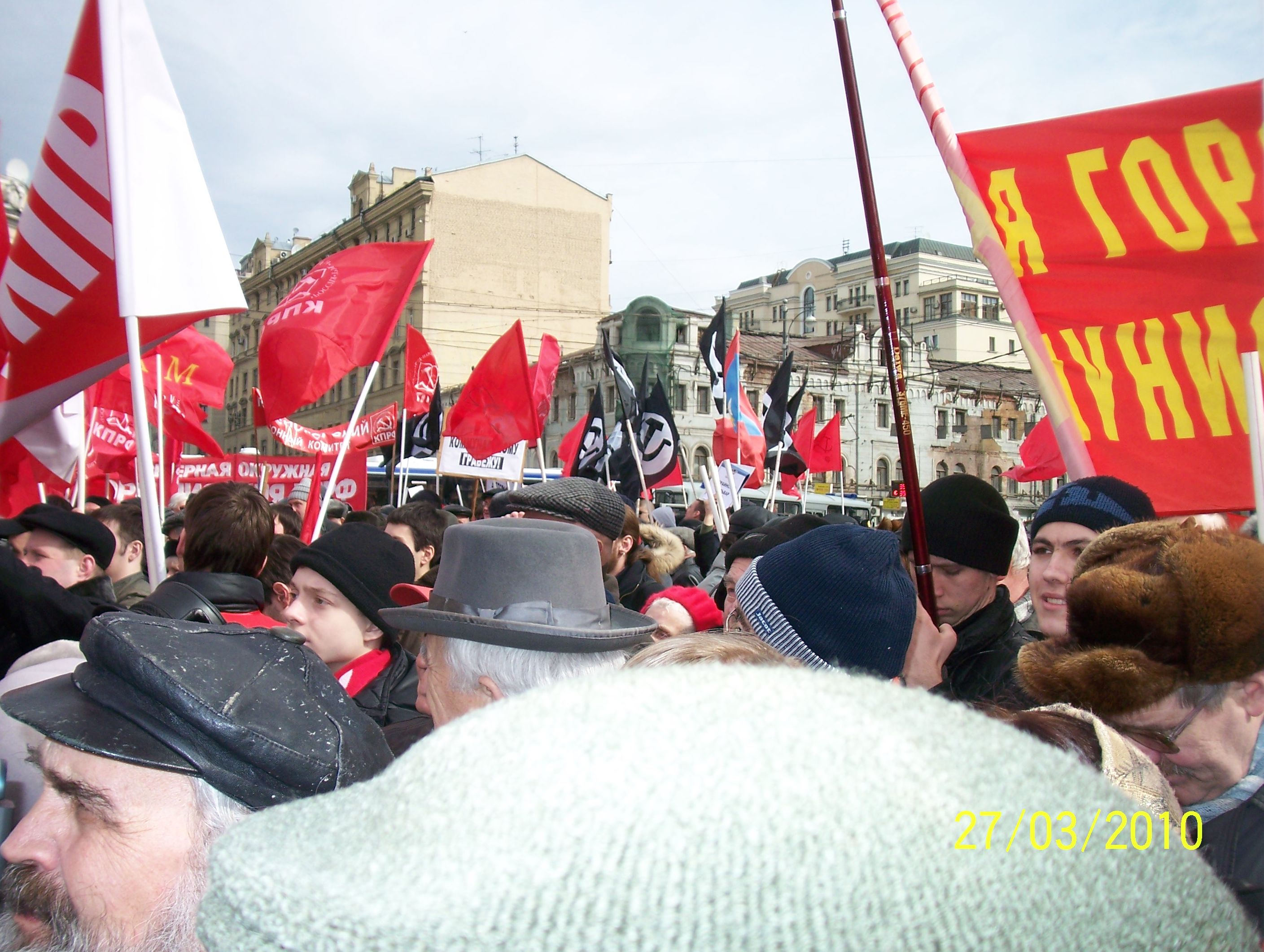 Руслан Тхагушев, Пресс-служба ЦК КПРФ. Фото Александр Крючков ![]() В этот день в столице дул сильный ветер. И особенно по-боевому развевались на нем красные флаги. Протестное настроение словно реяло в воздухе. Среди участников акции – коммунисты Москвы и Подмосковья, комсомольцы, представители Союза Советских офицеров, Движения в поддержку армии, Всероссийского женского Союза «Надежда России». Пришли на митинг со своими транспарантами и обманутые дольщики – несмотря на заверения властей, таких людей становится с каждым годом все больше. Они запустили в московское небо стилизованный дирижабль с требованием к государству обратить внимание на их проблемы. Акция проходила под лозунгами: «Нет капитализма – нет кризиса!» «Антинародное правительство – в отставку!» «Нет!» коммунальному грабежу!» «За антикризисные меры КПРФ». Митинг открыл секретарь МГК КПРФ Александр Потапов. Он отметил, что в стране изменяются часовые пояса, но народ только затягивает пояса. Власти говорят неправду о том, что кризис миновал. Он и не думал заканчиваться. Затем слово было предоставлено заместителю Председателя ЦК КПРФ, руководителю Всероссийского штаба протестных действий В.И. Кашину. Владимир Иванович передал привет от Председателя ЦК КПРФ Геннадия Андреевича Зюганова, который в это время проводил заседание Исполкома СКП КПСС. На этом важнейшем форуме вырабатывалась тактика совместных действий коммунистов из бывших советских республик по подготовке к 65-летию Великой Победы и противодействию наступлению капитала на социальные права граждан. «Сегодняшняя акция свидетельствует о том, что набухает недовольство нашего народа правящим режимом и проводимым им курсом, - обратился к участникам митинга В.И. Кашин. – Мы видим, что рукотворный кризис, в который втянула нас власть, продолжается. Увеличивается безработица, меньше становится доходов у большинства населения страны. Вздуваются цены на товары первой необходимости, лекарства, растут тарифы ЖКХ. Власть разбазарила триллионы народных денег, которые осели в карманах олигархов». В.И. Кашин подчеркнул, что за время правления Путина тарифы на ЖКХ выросли в 10 раз. Хотя еще в 2003 году «Единая Россия» обещала, что они снизятся в 2 раза. Еще одной темой, которую затронул В.И. Кашин, стало возможное участие военнослужащих НАТО в Параде Победы на Красной площади. Заместитель Председателя ЦК КПРФ подчеркнул, что сегодня в Европе раздувается русофобия. Советскую страну пытаются поставить на одну доску с Гитлером. Фашистские недобитки маршируют по улицам городов Прибалтики. В таких условиях участие НАТОвцев в Параде Победы является кощунственным, и коммунисты приложат все усилия, чтобы не допустить этого надругательства над нашими святынями. В.И. Кашин отметил, что выход страны из тупика возможен только на основе антикризисной программы КПРФ. Но для того, чтобы она была реализована, необходима мощная народная поддержка. «Если на улицы выйдут хотя бы 15-17% взрослого населения, то даже ОМОН и милиция вольются в наши ряды!», - подчеркнул заместитель Председателя ЦК КПРФ. Руководить фракции КПРФ в Московской городской думе Андрей Клычков в своем выступлении отметил, что программа правительства – это виселица, которая действует в интересах избранной группы олигархов и коррумпированных чиновников. Между тем