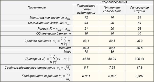 В проекте Пятого канала «Суд времени» три типа голосования: (1) голосование телезрителей по телефону; (2) голосование пользователей сети Интернет на сайте Пятого канала; (3) голосование зрителей в студии при помощи специальных пультов. Надо сказать, что итоги различных типов голосования существенно между собой разнятся. Есть и другие моменты, а в совокупности все они требуют некоторого анализа. Именно ему посвящен данный материал. 1. Какое из голосований важнее и почему их итоги разнятся? Конечно, наиболее значимым с социологической точки зрения является голосование телеаудитории – оно в наибольшей степени репрезентативно, лучше отражает настроения общества, нежели Интернет и уж тем более московская телестудия. При этом по итогам показа первых 9 тем можно сказать, что как правило результаты теле- и Интернет голосования между собой совпадают гораздо в большей степени, нежели каждый из этих замеров совпадает с результатами голосования в студии. Для подтверждения этого факта осуществим параметрическое и непараметрическое представление имеющейся на наших руках открытой информации. На рис. 1 приведен соответствующий график. Рис. 1. Итоги голосования телеаудитории, Интернет-аудитории и аудитории в студии по темам (в %) Параметрическая оценка итогов голосования при условии их стратификации по типам дает нам результаты табл. 1. Табл. 1. Параметрическая оценка поддержки позиции С.Е. Кургиняна по типам голосования Значения таких параметров как размах, дисперсия, среднеквадратичное отклонение и коэффициент вариации при их сравнении показывают, что голосование в студии является более случайной величиной, обладает существенным разбросом (хотя количество голосующих в студии много меньше участвующих в двух др. типах голосования). О чем этот разброс говорит? В первую очередь, он может говорить в пользу того, что аудитория в студии гораздо менее репрезентативна (вообще говоря, не является даже условной социологической выборкой), нежели другие типы голосования. Уже по этой причине ориентироваться на голосование в студии с точки зрения социологического анализа не стоит. Студийное голосование также отличается и по другим параметрам, прежде всего, по среднему и медианному значениям анализируемого ряда. Таким образом, поддержка позиции Л.Млечина (т.е. либеральной позиции) сравнительно более высока в студии, но по множеству причин эта поддержка имеет крайне низкий социологический статус, особенно в сравнении с другими типами голосования. (Да, любое голосование в такого рода проектах не является строгой социологической выборкой, однако оно способно отражать общественные настроения в самых общих и широких чертах). Меж тем Л.Млечин на радиостанции «Эхо Москвы» восхищался, что его позицию поддерживает студия. Общий тон высказывания как бы свидетельствовал в пользу того, что студия более ответственна в плане анализа аргументации сторон, и поэтому в большей мере поддерживает Млечина, нежели Интернет и телеаудитория. Конечно же, серьезный анализ не дает каких бы то ни было весомых оснований к тому, чтобы согласиться с этой позицией. Аудитория в студию набирается «с улицы» посредством соответствующего сайта «массовка.ру». О качествах этой аудитории много говорят соответствующие факты. Во-первых, это московский и преимущественно молодежный «