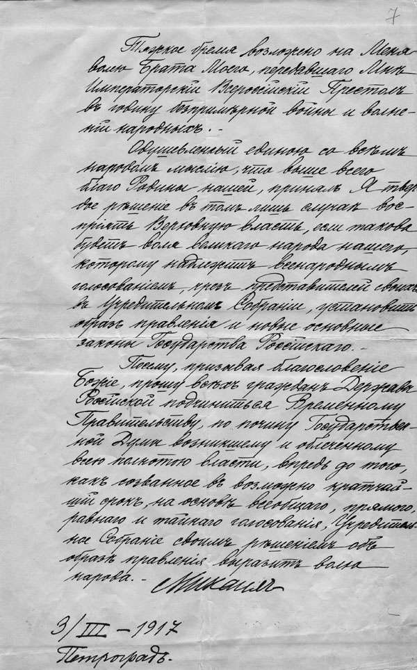 Итак, "политическое завещание" Михаила. Последнего некоронованного императора-местоблюстителя. Публикуется не впервые, но редко. Цитирую лишь основное, весь текст - внизу на скане Цитата: