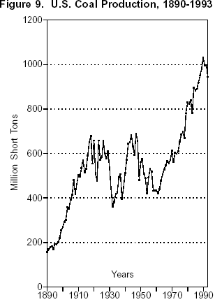 О каких таких «невиданных темпах роста» в царской России можно говорить, если каждый год там вводилось в строй в 7-8 раз меньше новых шахт, чем в США? При том, что трудовые ресурсы у Штатов были всё-таки даже меньше, чем в России? Петрович, прежде, чем уголь добыть, надо его разведать. Потом проложить дороги к шахте. Потом саму шахту вырыть, а это значит еще на земле заводище целый. Не знаю как Вы, а вот я видела, что такое шахта. Не угольная, сланцевая. Для вас, "теоретика индустрилизации", новую шахту построить - просто чёрный квадратик на карте нарисовать. Вы ж, экономику-то учили не по Марксу, а по "Экономиксу"? У вас мышление-то не привязано к конкретике. Гектары на крестьян умножать умеете, а подумать, что одних денег для постройки шахты недостаточно - это уже превыше Ваших сил. Даже если предположить, что весь мир ринулся бы в Россию вкладывать деньги в строительство новых шахт - это ничего бы не решило. Не было у нас нужного числа геологов, чтобы месторождения находить и оконтуривать. Не было у нас достаточно числа инженеров, чтобы дороги строить, и на них мосты проектировать. Хотя бы деревянные .Индустриализационный потенциал царской России в 1909-14 гг. никак не заслуживает всех ваших дифирамб, хоть вы там все тресните! Если взять американскую статистику за XIX век, то примерно такой же ряд цифр по угледобыче (20 - 22 - 24 - 29 - 31 - 34) мы обнаружим, наверное, где-нибудь в 1865-1870 годы. И были эти темпы громадными для того времени. И стояли за этими цифрами по США примерно те же производительные силы, что и в царской России 1910-14 годов. Царская Россия повторяла тот же путь, и те же темпы роста по добыче угля, что и США. С разницей в 30-40 лет. То есть, отставала от США по угледобыче на 30-40 лет. Давно это доказано, сроки отставания по разным отраслям различаются. На графике — угледобыча в США, 1890–1993, в короткин тоннах |