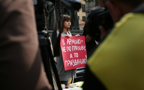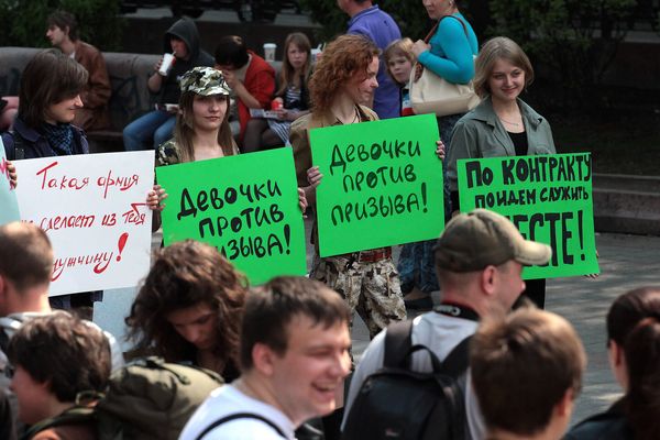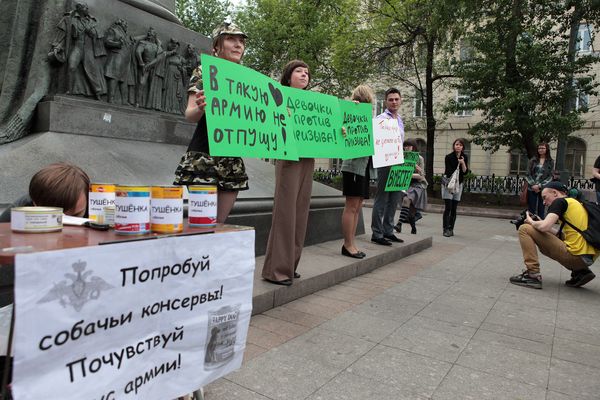 Сегодня на Чистых прудах прошла акция-перформанс против призывной армии, организованный инициативной группой при поддержке правозащитного сообщества «Гражданин и армия». Около десятка девушек, одетых в платья камуфляжной расцветки, брюки «милитари» и военные рубашки, маршировали возле памятника Грибоедову, скандируя на военный манер: «Маршируем за контракт! Мы за службу только так! Разве вырастят мужчину произвол и дедовщина?» Девушки держали в руках плакаты, выражающие протест против «забривания» любимого мужчины. «В Интернете нас обвиняют, что мы против армии вообще, пишут даже, что мы хотим развала и захвата страны. Это не так, - заявила организатор митинга Вера Кичанова. – Мы выступаем за эффективную армию. Все цивилизованные страны отказываются от призыва, пора и нам». Через несколько минут после начала акции к памятнику подошла подмога - активисты «Солидарности», которые разнообразили митинг откровенно политическими лозунгами: «Сына Иванова оденем в сапоги!», «Сердюкова на «губу»!» Листовки прохожие брали охотно и с идеей контракта соглашались. С интересом протянула руку за листовкой даже девушка, проезжавшая по Чистопрудному бульвару на гнедой лошади. Участники акции также предлагали прохожим попробовать собачьи консервы, напоминая о скандале на прошлой неделе, когда командование Внутренних войск МВД подтвердило, что в одной из войсковых частей солдат кормили едой для собак. «Попробуй собачьи консервы – почувствуй вкус армии!» - призывали активисты. Самые смелые и самые голодные журналисты ковырнули пластиковыми вилками содержимое банок, но «собачья тушенка» пришлась им явно не по вкусу. Под конец активисты затянули песню на мотив «Варшавянки»: «Вихри враждебные веют над нами и военкомы нас злобно гнетут…» Всего акция собрала около 30 человек, не считая журналистов. |