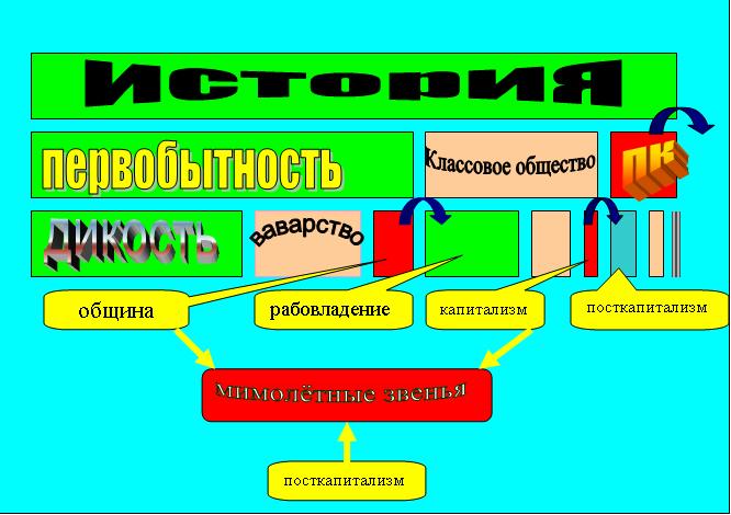 1. Предистория первобытный коммунизм, он же - ничто по Гегелю). 2. Скачок из царствия несвободы - неопознанной необходимости в царствие свободы - осозанной необходимости ( отрицание п/коммунизма - рабство, в тч капталистическое , оно же - становление по Гегелю ). 3. История ( отрицание отрицания, - коммунизм, он же - бытие по Гегелю)