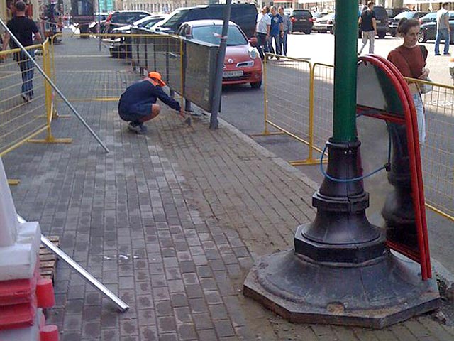 В понедельник в блогах появились сообщения, подкрепленные фотографиями, доказывающими, что в центре Москвы рабочие вместо того, чтобы класть плитку, которой столичные власти решили заменить асфальт, просто "дорисовывают" ее.
