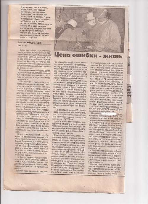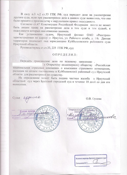 Дело касается моего клиента, который пожелал остаться неизвестным, по своим причинам, а я, как адвокат, не имею право выходить за рамки желания моего доверителя. Все остальные стороны юридического конфликта - публичные люди и одна страховая компания под названием Открытое акционерное общество "Российская национальная страховая компания" (ИНН 5407123252) или просто ОАО «Росстрах» http://www.rosstrakh.ru/ Начну с того, что недавно мной были получены: вступившее в законную силу определение судьи Братского городского суда Иркутской области Орловой Олеси Викторовны о передаче из города Братска гражданского дела по исковому заявлению моего клиента к ОАО «Росстрах» о взыскании страхового возмещения в Куйбышевский районный суд города Иркутска для рассмотрения по существу и кассационное определение, подтвердившее «правильность» такого судебного демарша, после трех долгих судебных дней разбирательств с 30 ноября 2010 года по 10 февраля 2011 года. Надо сказать, что это только в телепередаче «Час суда» вот тебе суд и тут же решение. Но мы то, к такому «часу» привыкшие. Удивляет то не это... К слову, расстояние между городами Братск и Иркутск составляет 615 км. Время в пути: 8:21. Расход топлива: 184.5 л. (при норме 30 л. на 100 км). Стоимость топлива: 3690 руб. (при цене 20 руб./л.). Плюс к тому надо добавить, что истцу надо или самому ехать там и жить или нанимать в Иркутске адвоката, что получается ещё дороже и бесконтрольно. Страховой полис получал и деньги за него отдавал мой клиент (житель Братска) в своем же городе по адресу расположения официального представительства ОАО «Росстрах» в городе: ул. Депутатская, 32, Гостиница "Братск", оф. 305-307. Надо сказать, что согласно уведомлению нашей городской налоговой службы, представительство ОАО «Росстрах» зарегистрировано в нашем городе ещё 05 сентября 2005 года (копия прилагается) и этой регистрации присвоен КПП № 380432001. И этот факт должен быть зафиксирован в Едином государственном реестре юридических лиц. Росстрах представил суду выписку из этого реестра по состоянию на 16 ноября 2010 года, где сведения о Братском представительстве отсутствуют, что уже само по себе, является нарушением Закона самим Росстрахом. Однако, сути дела это обстоятельство не меняет, так как клиенты фирмы не должны страдать из-за несвоевременной подачи сведений Росстрахом о его новом представительстве. И это суд, как никто другой, должен понимать. Но не тут то было... Осмелюсь предположить, уже в который раз, что видимо, судья Орлова не знает, что такое КПП (Код Причины Постановки на учет в налоговом органе), который ею обозревался в суде в виде уведомления ИФНС. Спешу ей напомнить, что в соответствии с абз. 2 п. 1 ст. 83 части первой Налогового Кодекса РФ организация, в состав которой входят обособленные подразделения, расположенные на территории Российской Федерации, а также в собственности которой находится подлежащее налогообложению недвижимое имущество, обязана встать на учет в качестве налогоплательщика в налоговом органе, как по своему месту нахождения, так и по месту нахождения каждого своего обособленного подразделения и месту нахождения принадлежащего ей недвижимого имущества и транспортных средств. Комический итог такой «неосведомленности» суда таков: «КПП» у ОАО «Росстрах» в городе Братске есть, о чем есть документ а совести у судьи и "КПД" от такого с