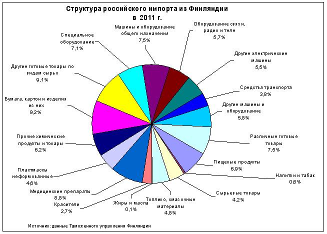 Как видим, сырье представлено очнь слабо (если не сказать "никак"). Наиболее значительный вклад в положительную динамику стоимостных показателей российского импорта из Финляндии внесли поставки машин и оборудования. Прирост импорта по данной товарной группе составил 556 млн. долл. или 26,9% по отношению к уровню 2010 г. На 52,1% по сравнению с 2010 г. увеличились поставки специального оборудования. Стоимость импорта дорожных транспортных средств в 2011 г. выросла на 32,7% по сравнению предшествующим годом, импортные поставки электрооборудования в стоимостном выражении увеличились на 41,1%, благодаря чему удельный вес данной позиции в общем объеме импорта вырос по сравнению с аналогичным прошлогодним периодом с 4,6% до 5,5%. Поставки машин для базовых отраслей промышленности увеличились на 25,4%. Такие дела. Даже без ВТО. |