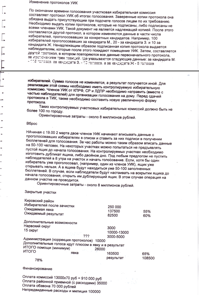 "10 октября 2011 года в Интернете появился скан документа, составленного в 2008 году в Петербурге для служебного пользования организаторов "честных" выборов. Комментаторы назвали его "Инструкцией по фальсификации результатов выборов". Если более точно, то это собственно не вся инструкция, а лишь её раздел, посвящённый "экономическому обоснованию" жульнических мероприятий и расчётам необходимых для этого денежных средств.
