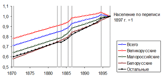 Анализ трендов по группам (рис. 2) показывает, население Великорусских губерний в конце периода может быть несколько завышено, а отнесенных к группе «остальные» - занижено. Это означает, в частности, что более высокие, как мы увидим далее, показатели по Великорусским губерниям, скорее всего, несколько занижены.