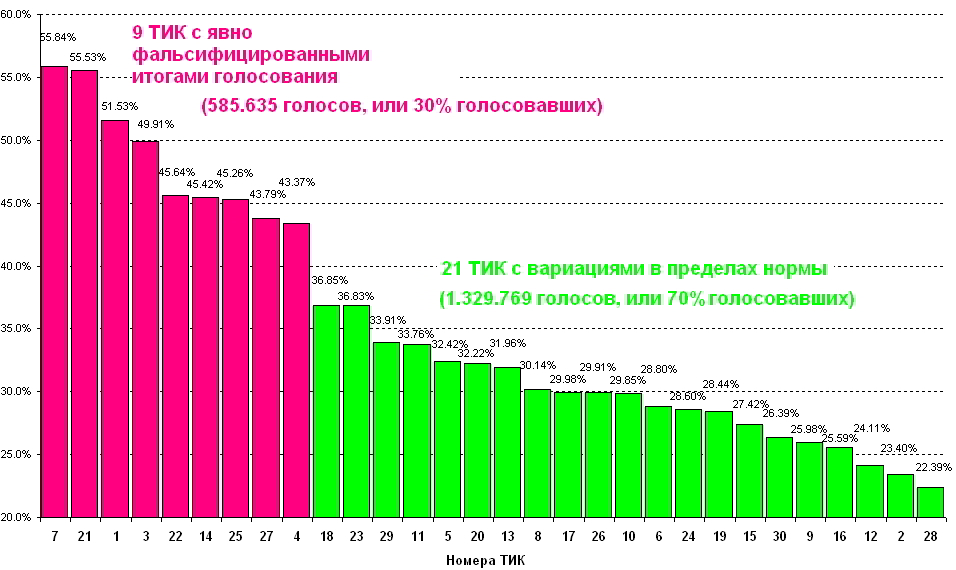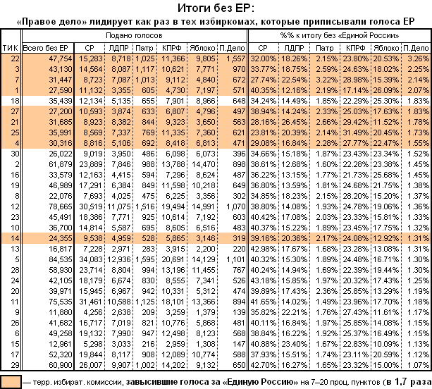 Источник данных по предыдущему графику и по таблице, которая ниже — данные по всем 30 ТИК, скачанные с сайта Центризбиркома.