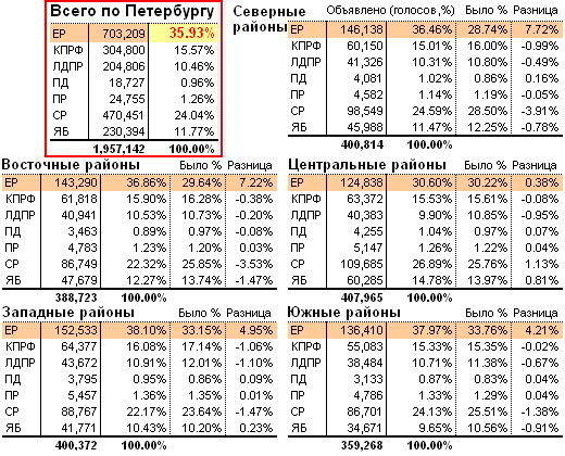 Источник: http://www.fontanka.ru/2011/12/07/065/)Свести эти данные в таблицу (см. ниже) минутная работа. Но в видах грядущей через несколько часов демонстрации горизбирком примитивно и пошло струсил. Иначе немедленно возник бы вопрос: