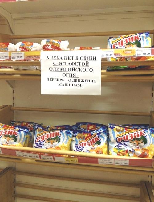 Вот она демократия и власть Путина.Хлеба уже нет.А завтра нород по лагерям будут отправлять.Не может Путин с демократией народ накормить.Враг он,надо его судить не после смерти.А прям сейчас.Люди без хлебушка сидят.А он Олимпиаду открывает!Разве это не преступление века?!!Вам нужны факты?Они вот!